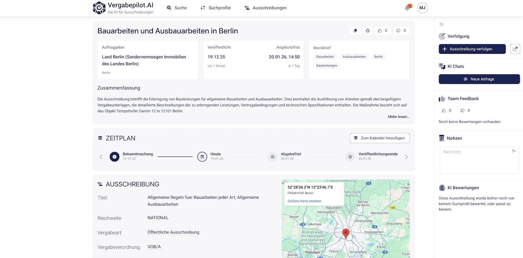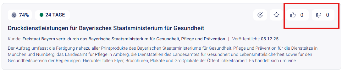 Die Möglichkeit, Ausschreibungsergebnisse der KI positiv oder negativ zu bewerten, hat uns enorm geholfen. Durch eure Rückmeldungen konnten wir die Qualität der Ergebnisse deutlich steigern und die KI gezielt weiter verbessern. Das Feedback aus der Praxis macht den Unterschied.