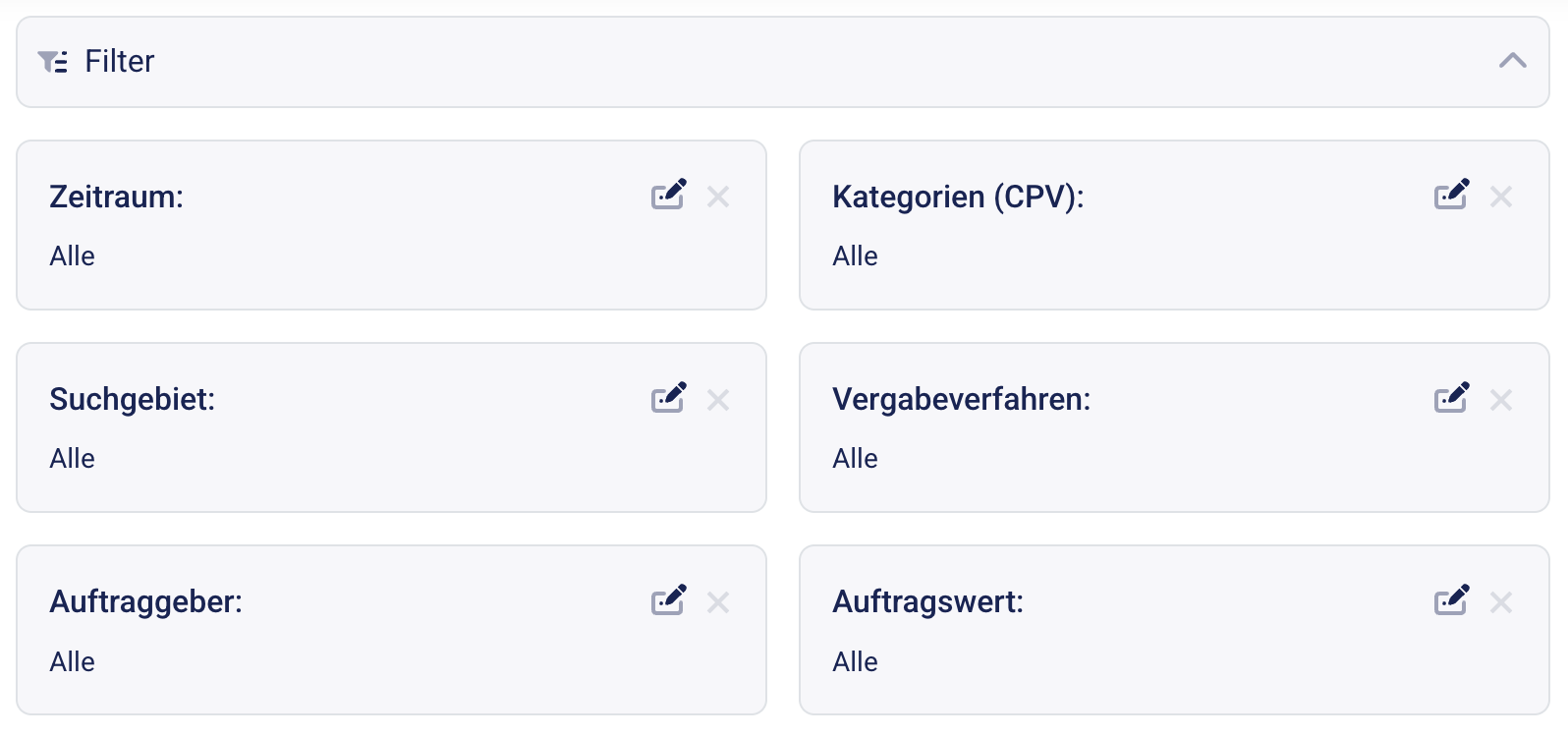 Mit zusätzlichen Filtermöglichkeiten wie Auftragswert, Vergabeverfahren oder Suchgebiet kannst du Suchergebnisse viel genauer eingrenzen. Das macht die Recherche effizienter und führt schneller zu relevanten Treffern.