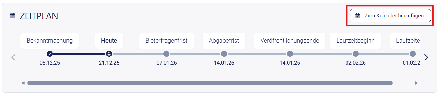 ![]() | Nachvollziehbare Historien für abgelaufene Ausschreibungen Künftig kannst du auch abgelaufene Ausschreibungen inklusive ihrer Details einsehen. Diese Transparenz hilft dir, Entwicklungen besser zu beurteilen und strategische Entscheidungen fundierter zu treffen. |