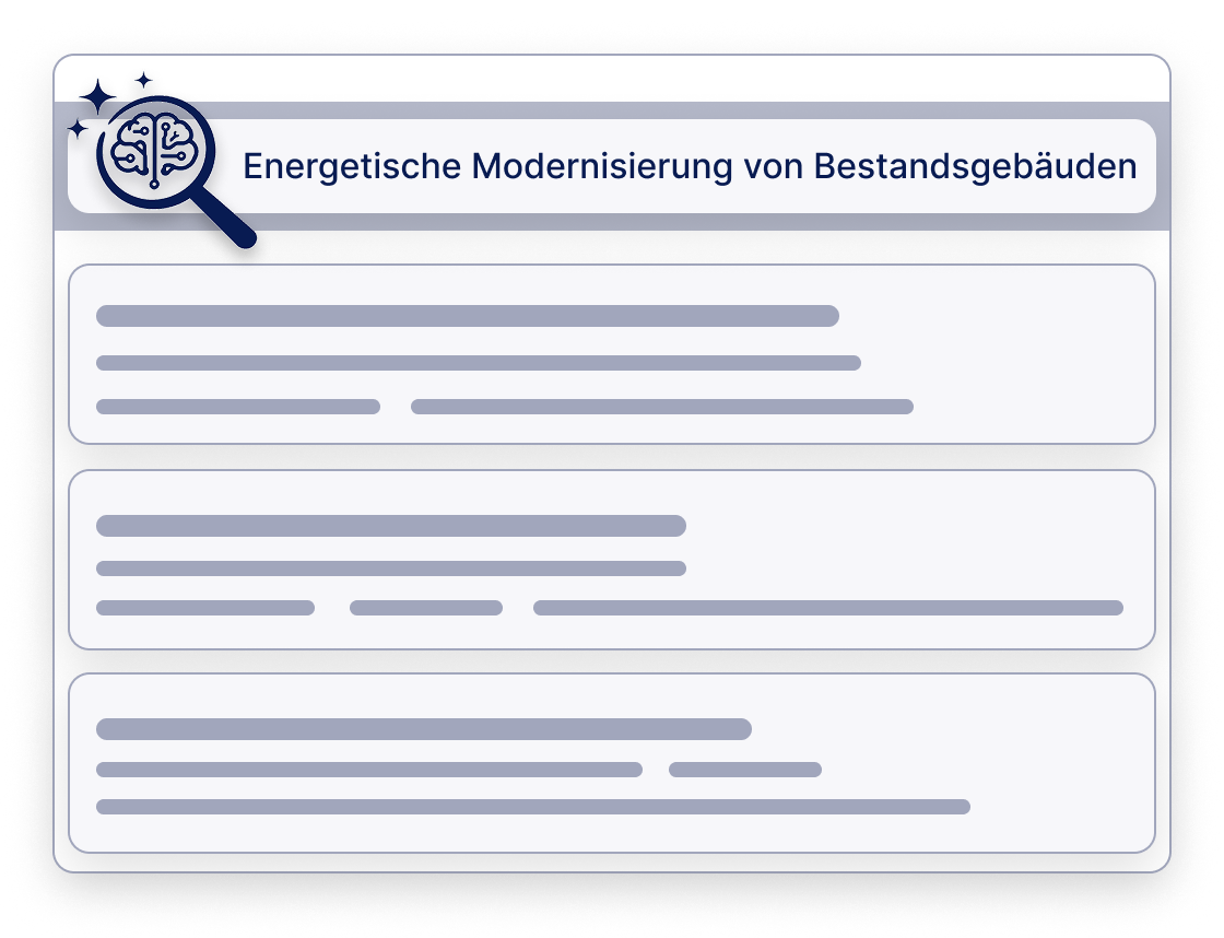 Unsere KI-Suche versteht inhaltliche Zusammenhänge statt nur einzelne Stichworte. Somit hast du weniger irrelevante Treffer und mehr passende Ausschreibungen.